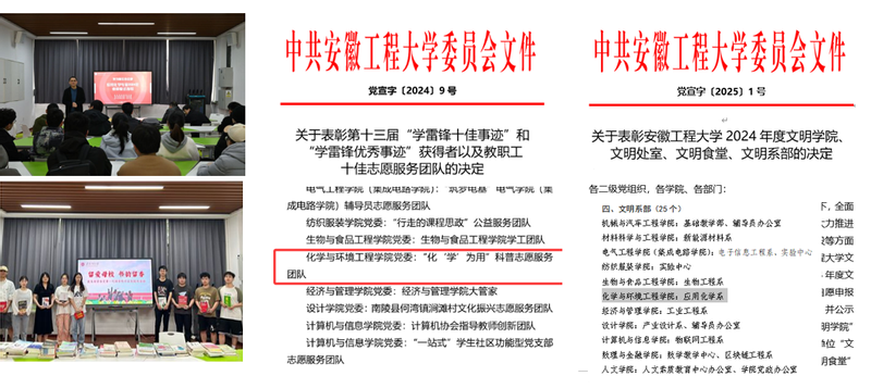 人才培养方面:学生获得省部级及以上竞赛奖励50余项,其中国家级一等奖1项、省部级一等奖5项。获批省级及以上大学生创新创业训练计划项目30余项。本科生参与发表学术论文及发明专利18人次,其中本科生以第一作者身份发表SCI论文3人次。支部以大学生化学实验竞赛为平台,打造学校“一院一品”重点建设项目,在2024年第十三届全国大学生化学实验竞赛中斩获全国一等奖,系安徽省省属高校唯一。并且通过与学生党支部共建、开展考研辅导等活动为毕业生搭建就业渠道,2025年应用化学专业多名本科生考入“双一流”重点院校,学生就业率、考研率稳步提升。此外,应用化学系教师指导的多名2025届硕士毕业生被国内知名院校录取为博士研究生,为博士点申报工作助力。