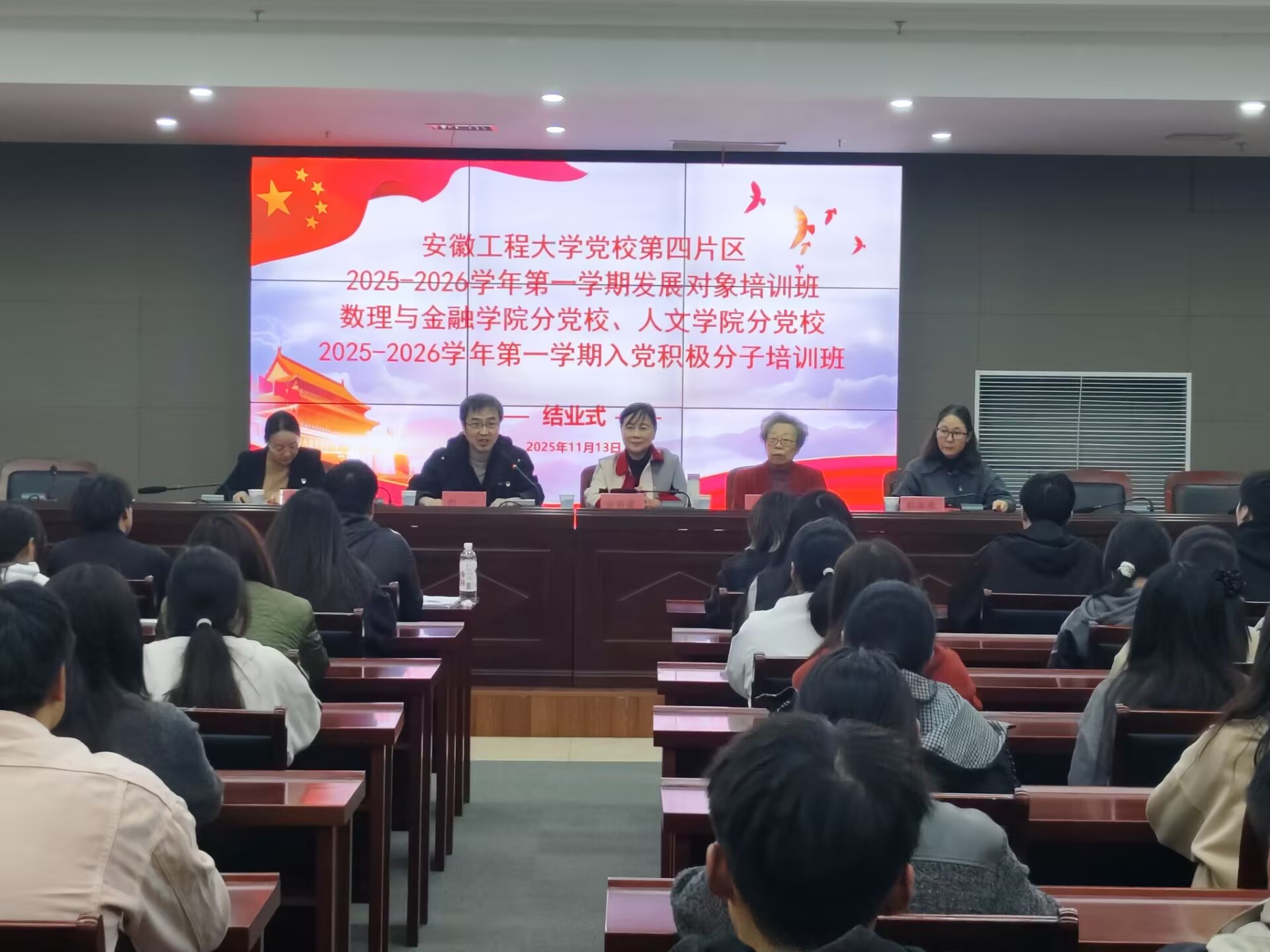 11月13日下午,校党校第四片区2025-2026学年第一学期发展对象培训班,数理与金融学院分党校、人文学院分党校2025-2026学年第一学期入党积极分子培训班结业式在学校图书馆202会议室顺利举行。校党校督导余新霞、乔泽静到会指导,人文学院党委书记刘一、数理与金融学院党委书记彭海燕、马克思主义学院党总支副书记裴利萍、培训班班主任和全体学员共同参加结业仪式。结业式由刘一主持。