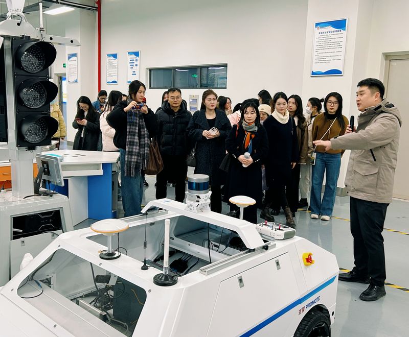 此次研学聚焦工科领域核心实验室与前沿技术,研究生党员们先后走进机械原理实验室、数控加工实验室、机器视觉实验室等多个专业实验室,近距离聆听动作捕捉技术、预瞄悬架技术及无人机追踪技术等前沿科研成果。在机械原理实验室,张振副院长从机械传动基础原理切入,结合实物模型,生动阐释了齿轮、连杆等核心机械构件的工作机制,让党员们直观理解了机械领域基础概念的内涵;数控加工实验室里,自动化加工设备的精准运作令人震撼;移动机器人控制实验室、机器视觉实验室里,动作捕捉、预瞄悬架、无人机追踪等前沿技术的应用魅力直观呈现,不仅让党员们沉浸式触摸到工科技术的硬核实力,更为未来工程类文本翻译搭建起“技术实景 —语言表达”的转化桥梁,让专业翻译更具精准度与实践深度。