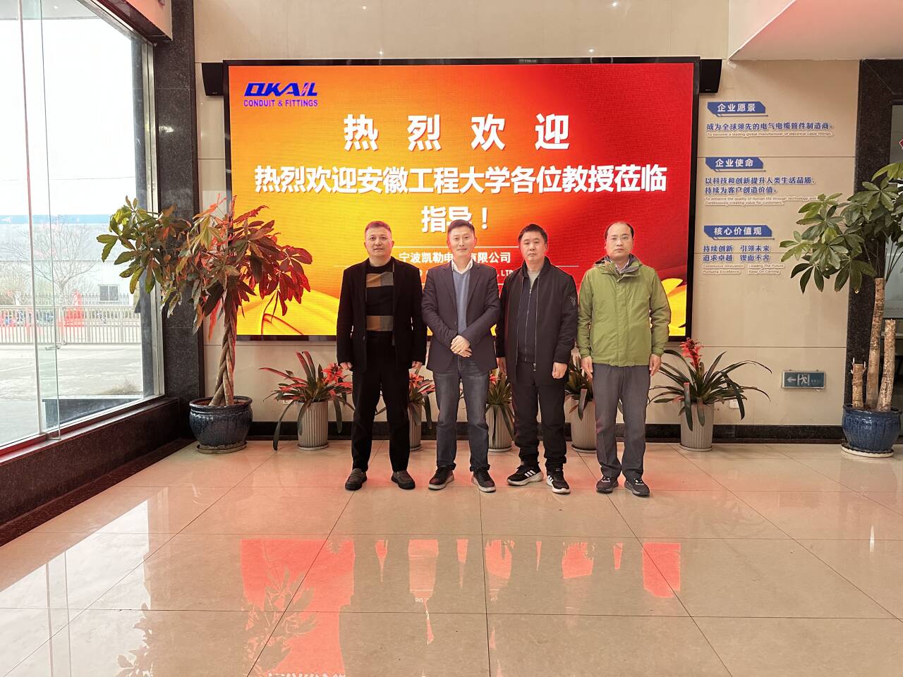 为强化党建引领,扎实推进“融立方・同心圆”跨学院教师党支部共建工作,充分发挥校企协同育人优势,助力毕业生高质量就业与产学研深度融合,1月26日,安徽工程大学环境学院杨晓凡教授(走访活动负责人)、机械与汽车工程学院苏永生教授、电气工程学院徐晓光教授一行,专程走访宁波走访优秀校友企业——宁波凯勒电气有限公司进。公司董事长兼总经理李中祥(我校 2008 届国际贸易专业毕业生)热情接待跨学院教师党支部成员,双方围绕党建共建、校企合作、人才培养、技术研发等议题展开深入交流,达成多项合作共识。